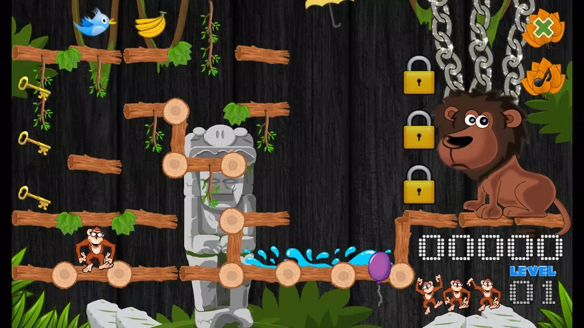 Collect a key, dodge the birds, jump onto vines, drop on the umbrellas, rise on the balloons and un-lock a chain.... go back and repeat until all three chains have been un-locked!