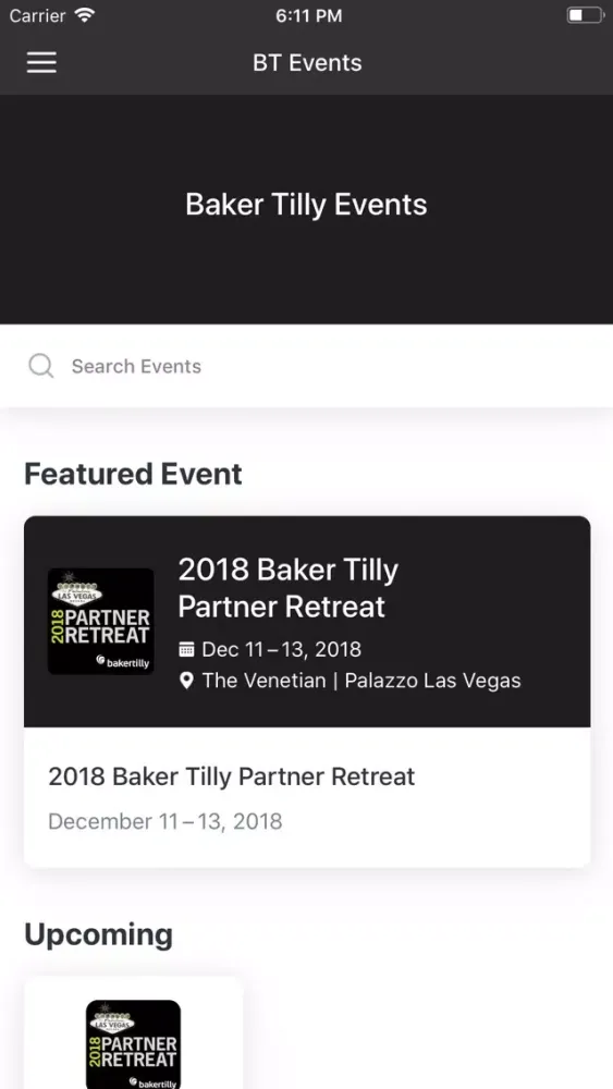 For each event, you will be provided a code that will give you access to that event’s content. Baker Tilly Events is a multi-event app that provides you with access to information, tools, and content needed when attending our firm-wide conferences, events, and meetings.