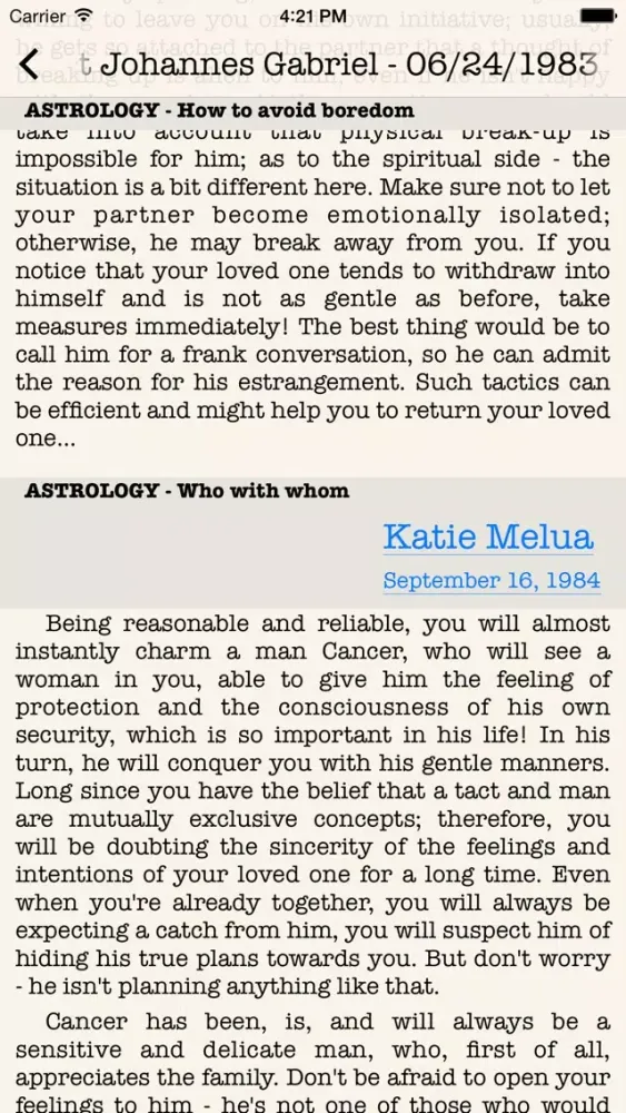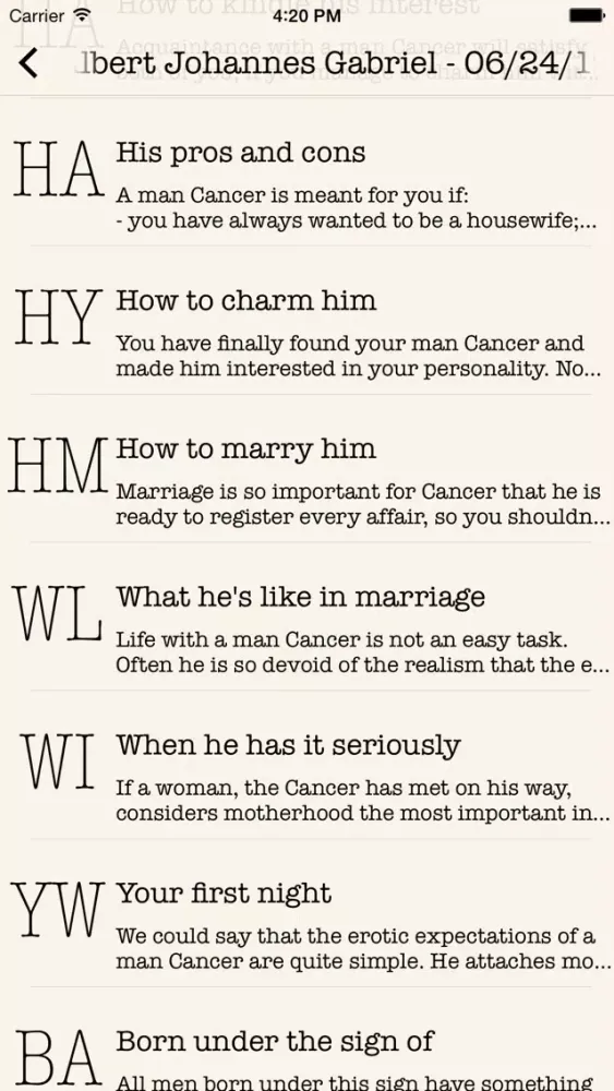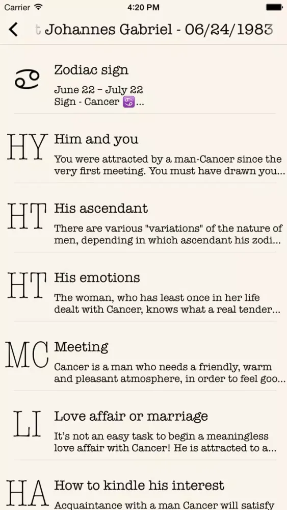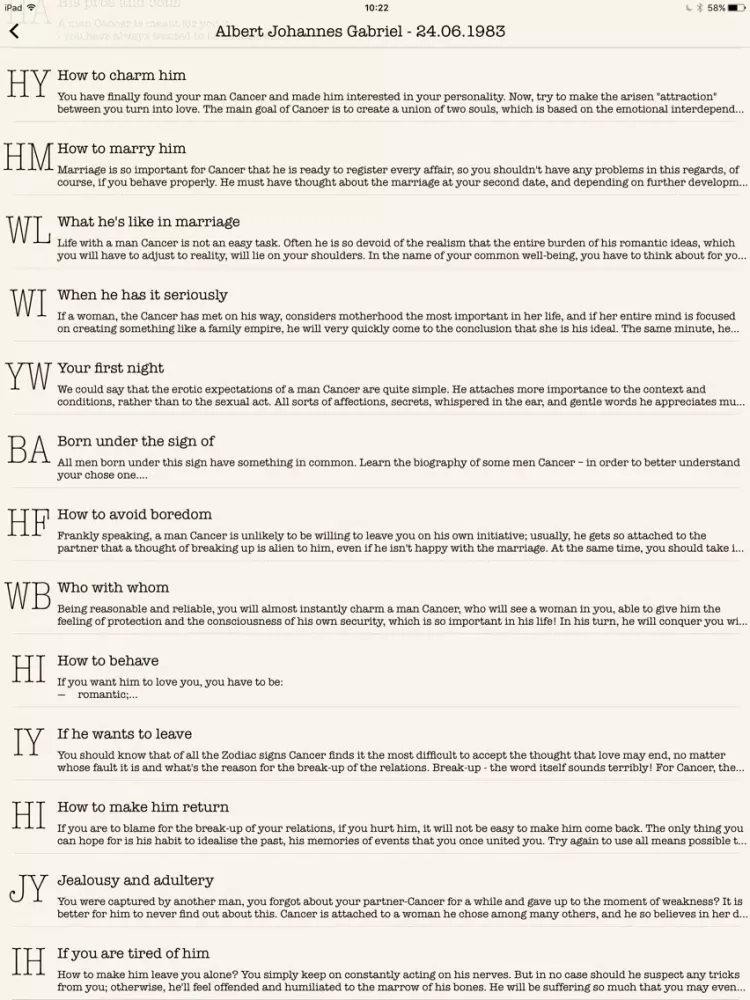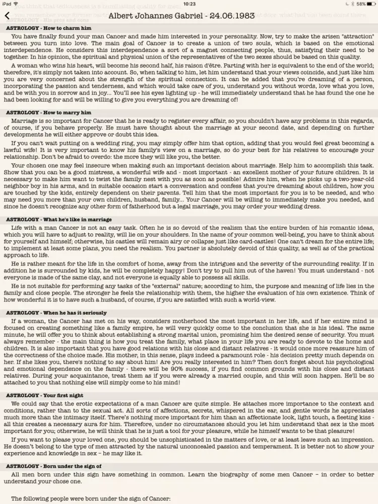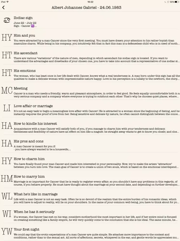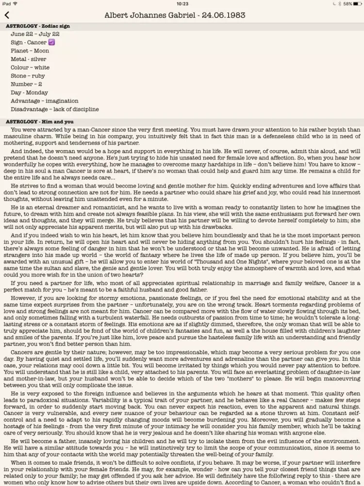 This program contains 500 A4 pages of the exciting information about romantic relationships and characteristics of all the zodiac signs, as well as a lot of tips on how to act not to be defeated in the love-life.