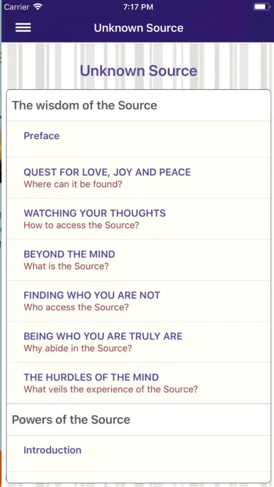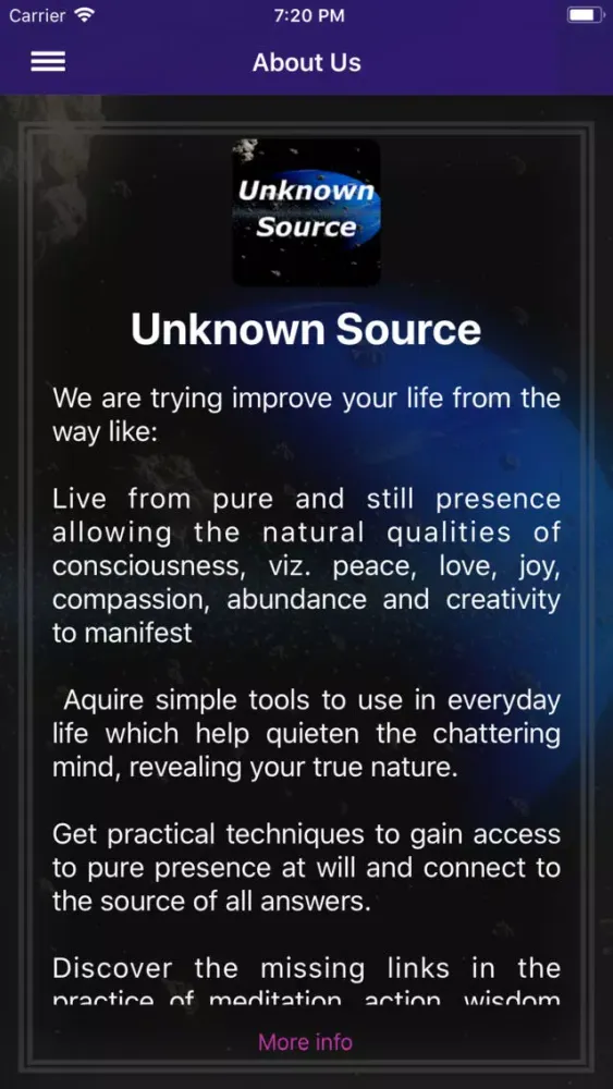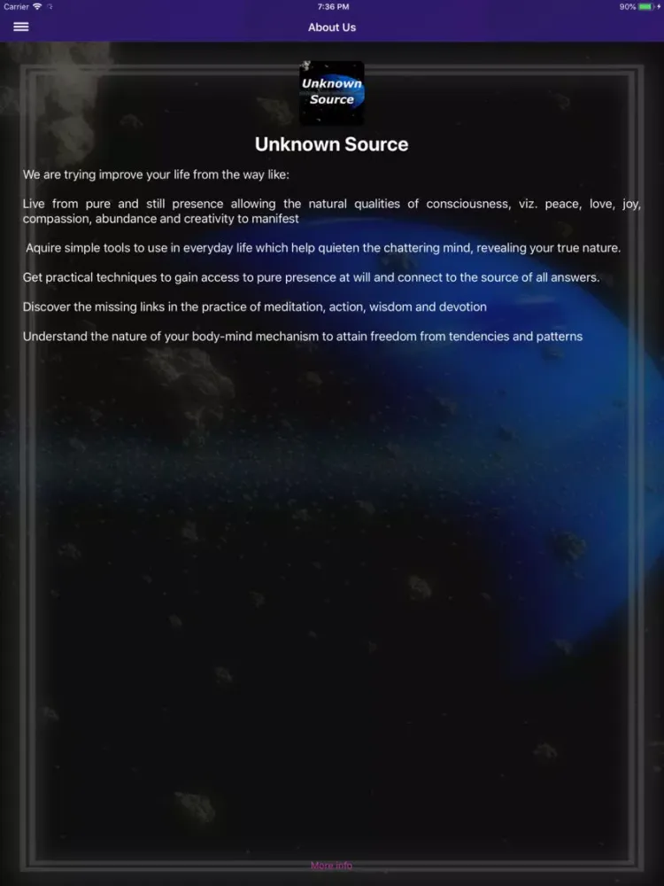 The Unknown Source is app have a set of Questions and answers and Meditation that will help you to understand the law of attraction, the power of the mind, positive thinking, success tips, mind tips, the map of success, performance tracking and much more.