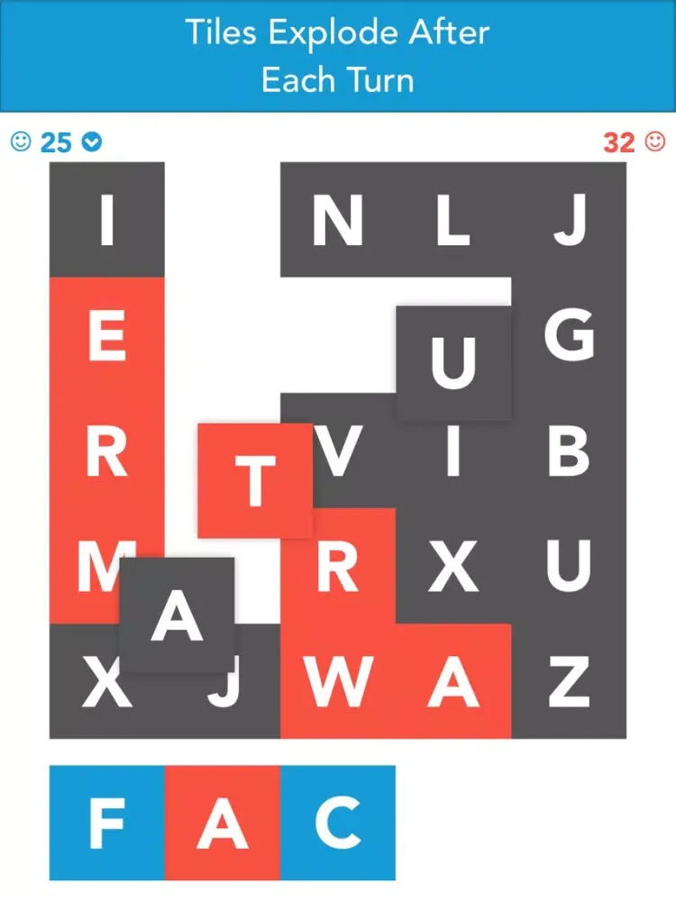 BOOM! That’s the sound of exploding tiles and your opponent’s ego crumbling as you blow up their words yet again. Play your best words one move at a time on a game board that explodes after each turn. Steal points from your opponent or push your score forward before all 100 tiles have been played - that is your challenge!