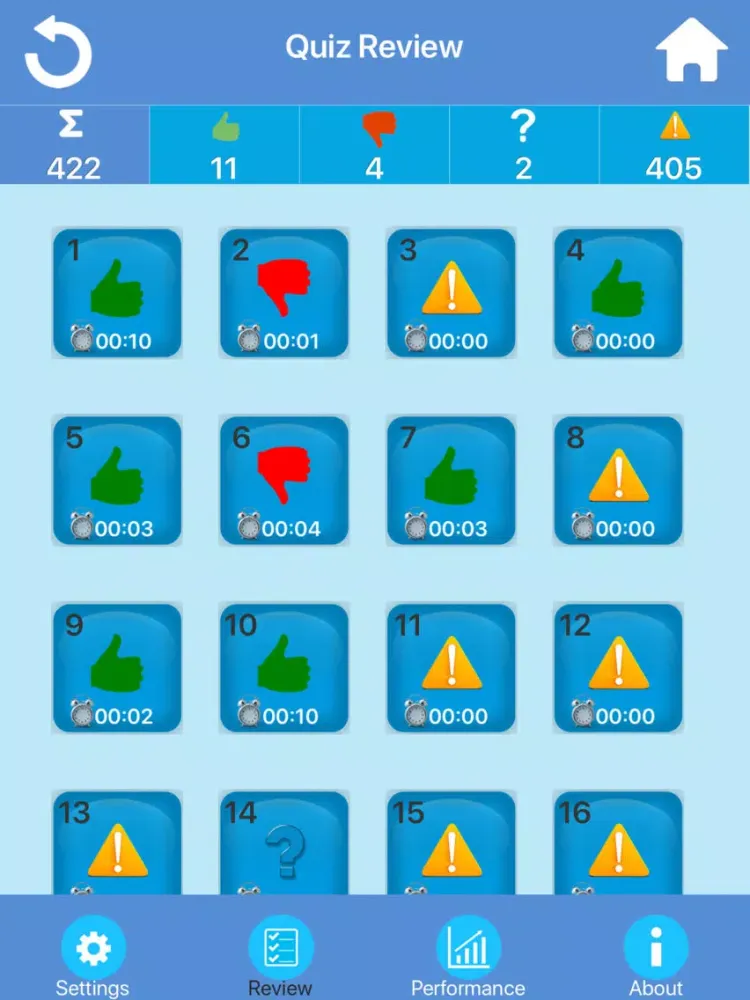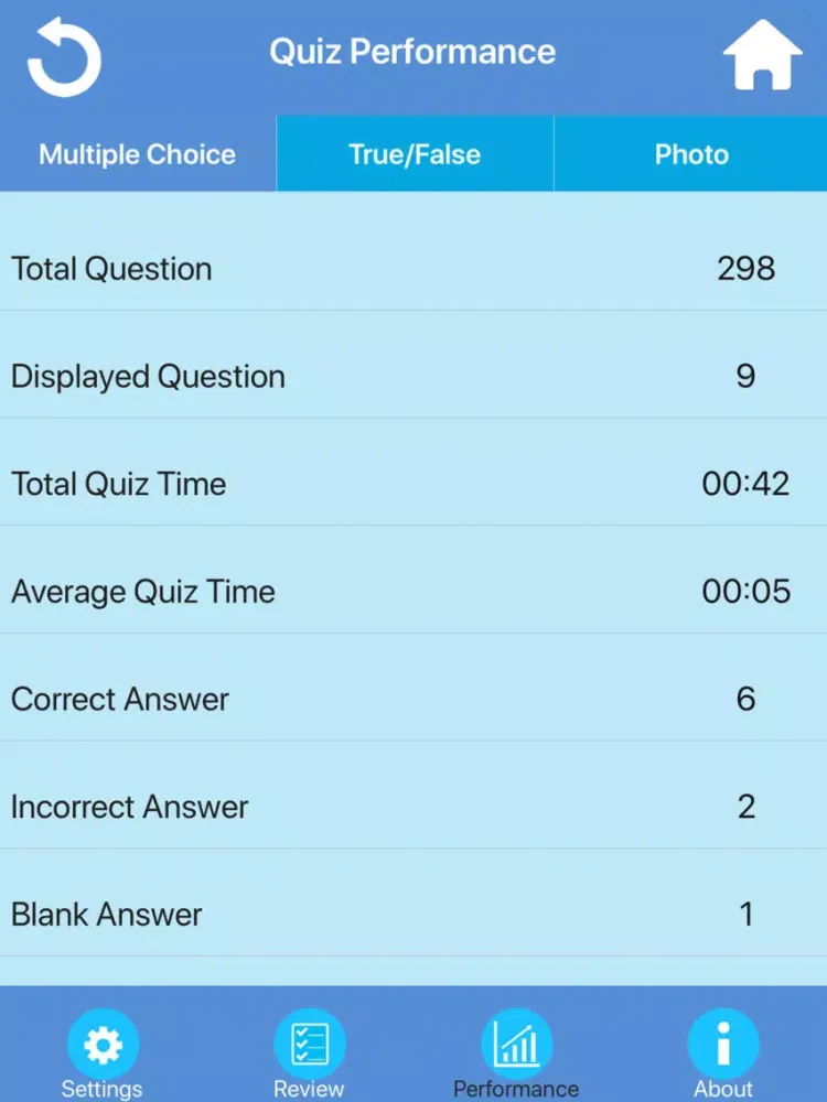 - View quiz performances by Multiple Quiz and True False Quiz mode by seperate.