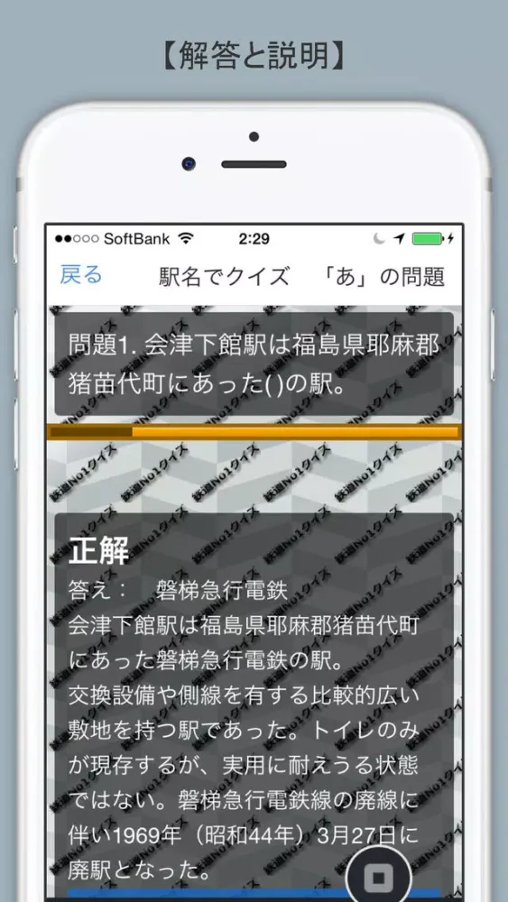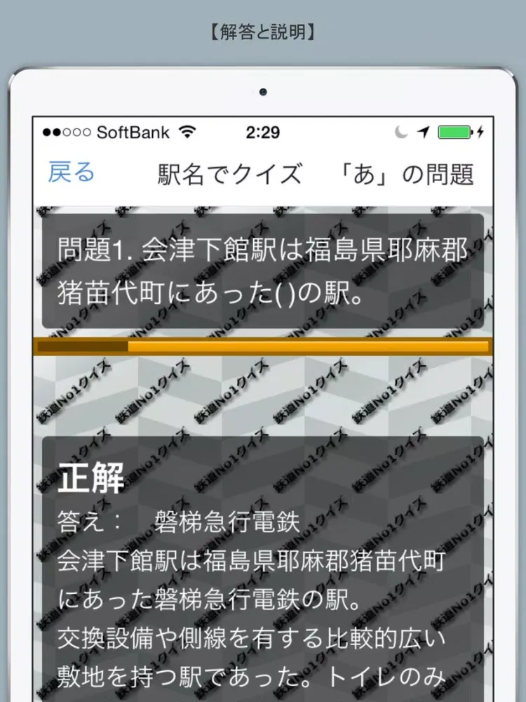 クイズの内容は、鉄道マニアなら答えられて当然の問題がてんこ盛り。いやいや鉄道マニアでも少し頭を抱えてしまう問題もありますよ!解答に解説もあるので、このアプリであいうえお順に問題の解答を勉強出来ます。クイズにチャレンジして、分からなかった解答を勉強しましょう。