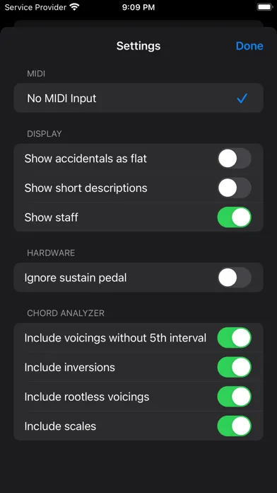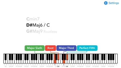 The notes are analyzed instantly and matching chords are displayed based on user preferences. The results show the set of possible chords with intervals the notes represent, relative to the root note. The analysis includes inversions and rootless voicings. This application works with a MIDI compatible device and/or with the on-screen piano keyboard but please note, it does not play any sounds.