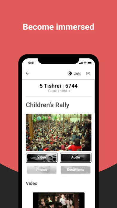 Be uplifted as the Rebbe teaches a plethora of timely topics with practical life lessons; listen in as the Rebbe advises individuals to navigate their challenges – whether in parenting, business or relationships. Join thousands as they are swept up in the notes of a heartfelt Chasidic melody, browse meticulously-restored archival photos, or experience a full-length Farbrengen (Chasidic gathering and public address) with the Rebbe.
