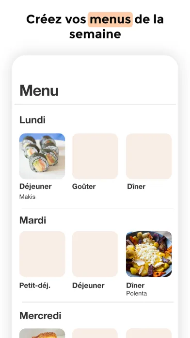 *Créez vos menus de la semaine en 1 minute grâce à la fonction glisser-déplacer et aux suggestions de vos recettes de saison les plus rapides.