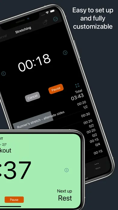 Choose to run your timer in a detailed view that auto-scrolls through intervals or a full-screen mode for a larger, easily visible display. Both modes support portrait and landscape orientations.