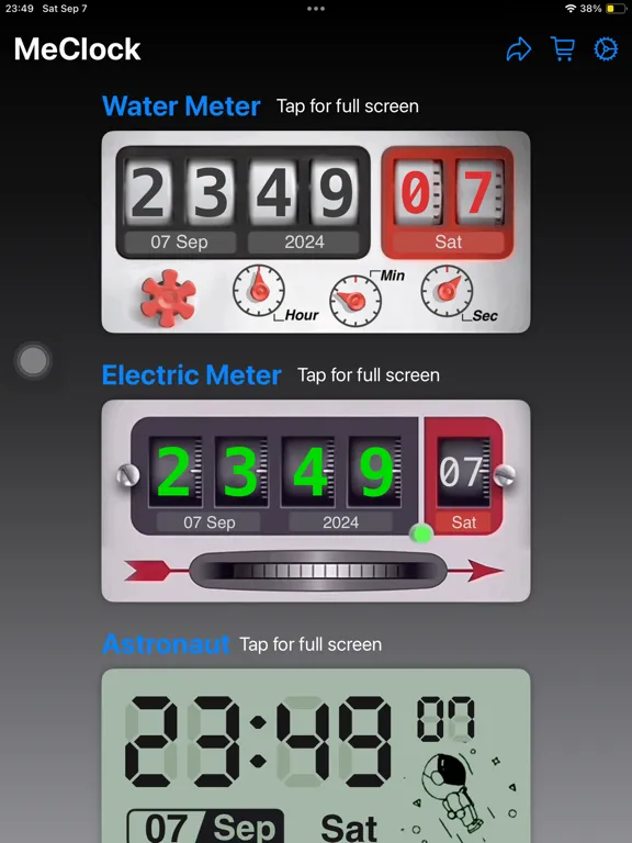 In the water meter and electric meter clock designs, you can freely customize the colors of the hour, minute, and second hands to create a one-of-a-kind clock visual. The astronaut clock offers multiple background colors to add more personalized touches to your desktop. Each clock design is meticulously crafted, making it perfect for full-screen display or as a desktop widget for quick time checks, bringing a touch of elegance and fun to your daily life.