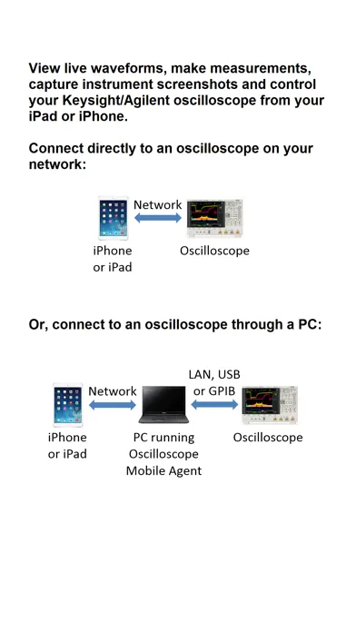Keysight Oscilloscope Mobile is the result of an investigation by Keysight Labs. It enables you to view live waveforms, make measurements, capture instrument screenshots and control your Keysight/Agilent oscilloscope from your iPad or iPhone.