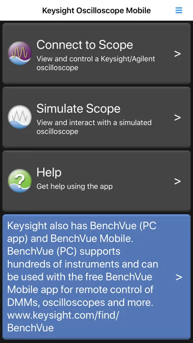 (Note: you may also be interested free Keysight mobile app named BenchVue Mobile that supports oscilloscopes, spectrum analyzers, function generators, DMMs, and power supplies.)