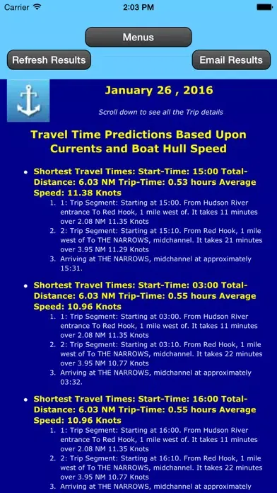 And now for the power of this app… You will be given a few choices on what time you should leave and what time you will arrive based on the tidal currents from the start of your trip to the end. Pick the quickest trip and save time and money on fuel!