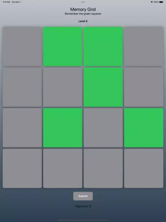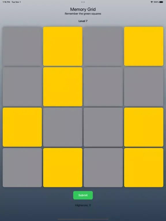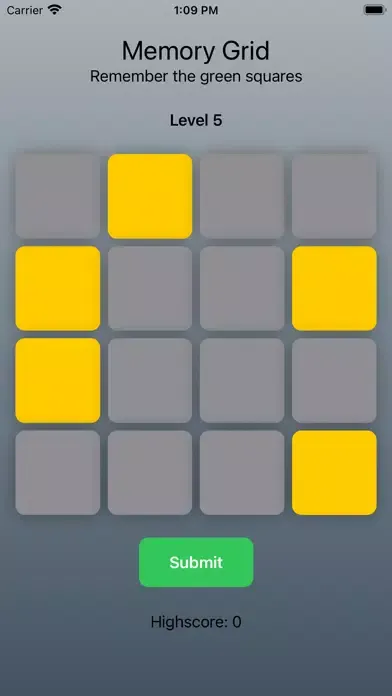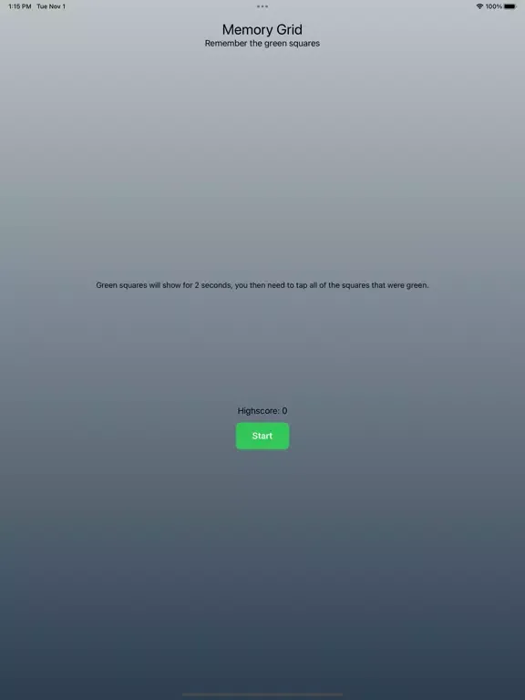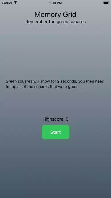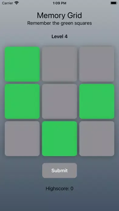 The memory grid game tests your memory by showing a grid of squares. You'll have 2 seconds to remember which of the squares are green and then tap those squares after. As you get more and more correct, the number of squares increases.