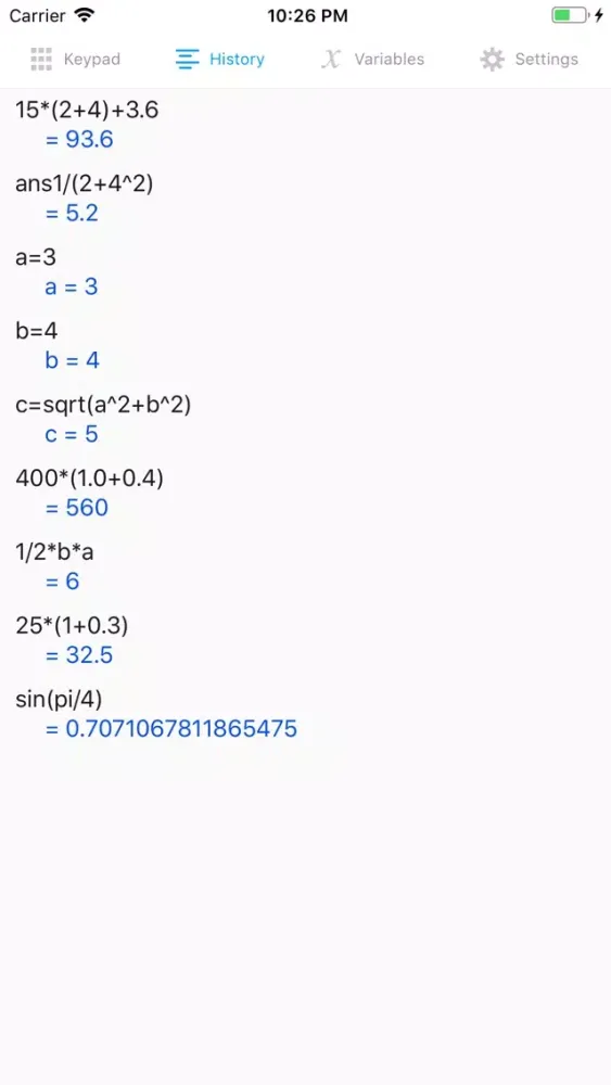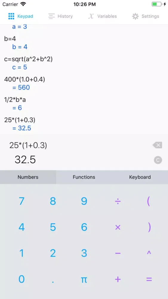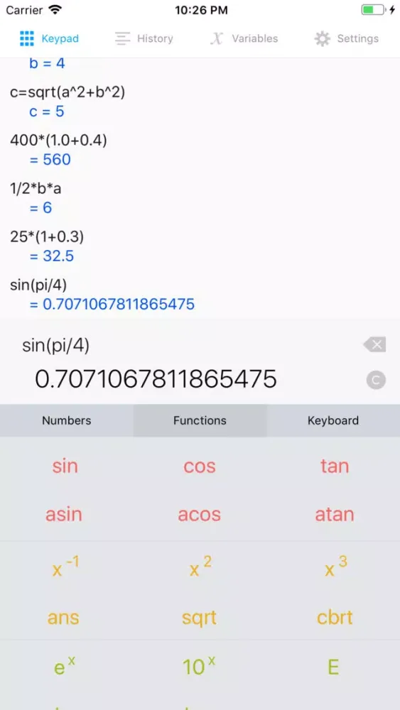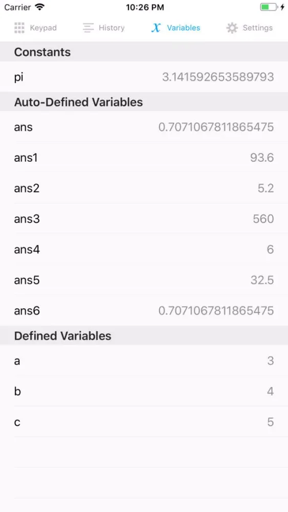 PEMDAS is comprised of several tabs. The Keypad tab has a number pad, a function pad, and regular keyboard to let you quickly type and calculate equations. PEMDAS saves all your equations and results until you clear them, and the History tab lets you view all the equations you've calculated. PEMDAS auto-assigns variables to every result, which you can access in the Variables tab.