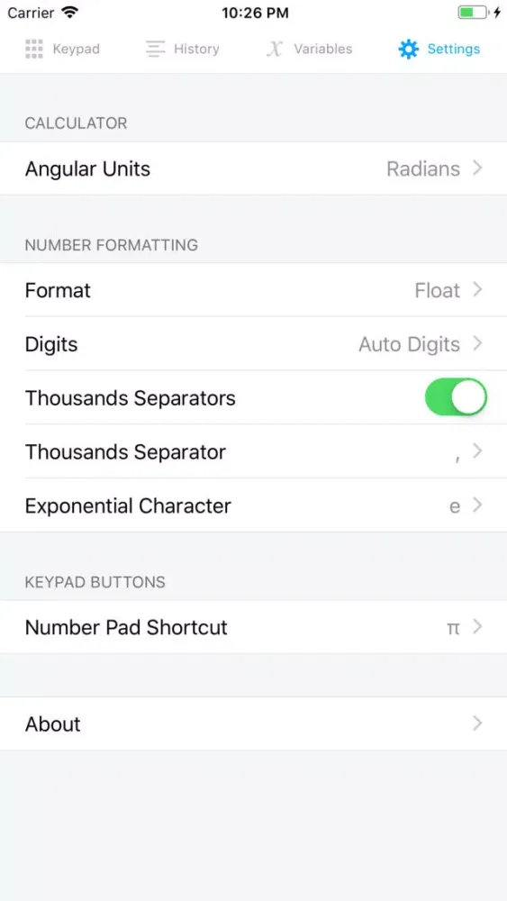 In the Settings tab, PEMDAS lets you easily switch between degrees and radians. PEMDAS also has several number formatting options, including scientific and engineering notation, and letting you set the amount of significant figures or decimal places displayed.