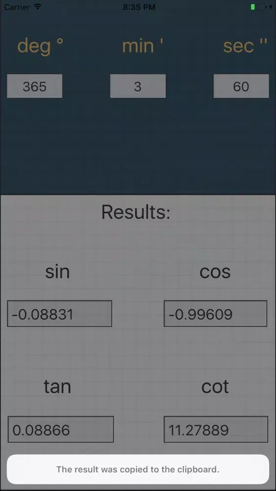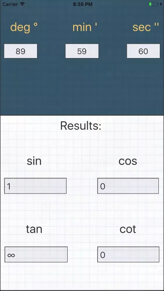 Now you do not need to buy books with tables or look for sites with tables online. In this application, you do not need to know how to use, just enter the data in the task angles, minutes or seconds and you immediately get a solution to the cosine, sine, tangent, and cotangent.