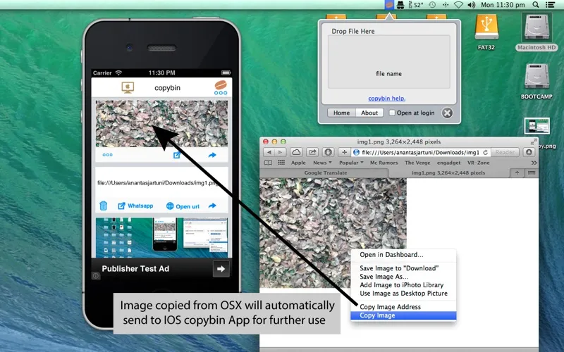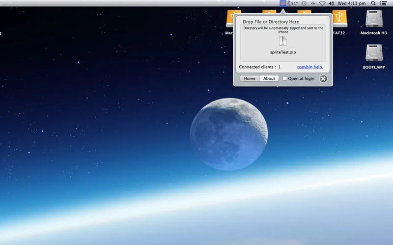* Drag and drop any file to "copybin" desktop osx app, and the file will be automatically transferred to IOS "copybin" app if it run.