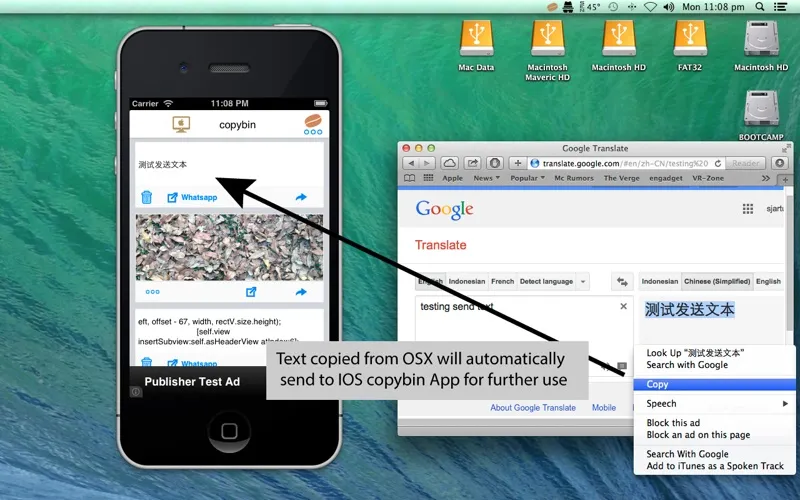 * Whenever you copy text or image from any application on OSX Desktop, the text or image will be send and copy automatically to "copybin" IOS client app if its run.