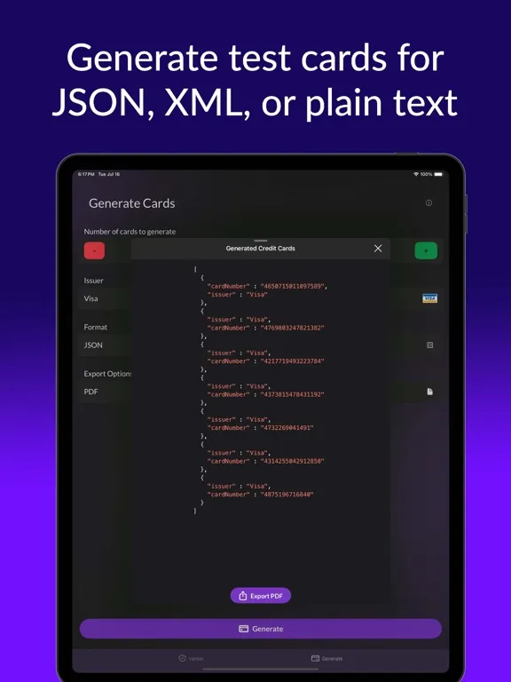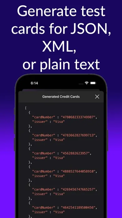 Versatile Formats: Generate test card numbers in JSON, XML, or text for seamless integration.