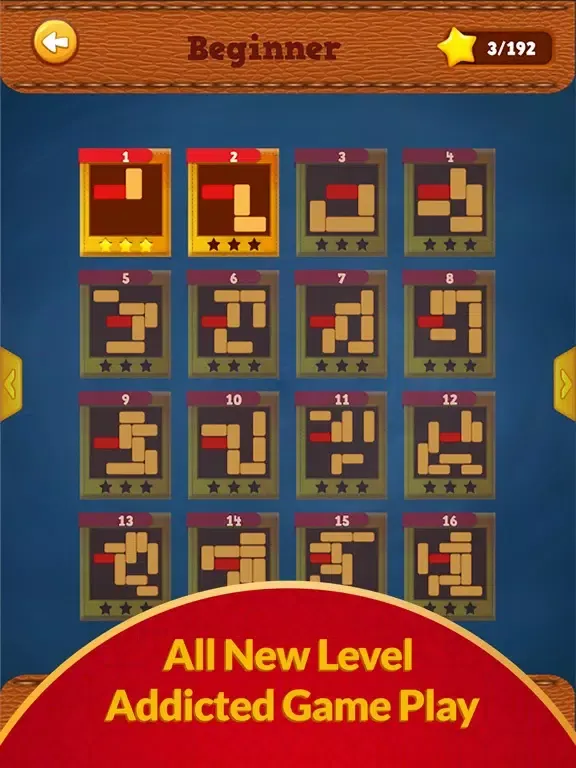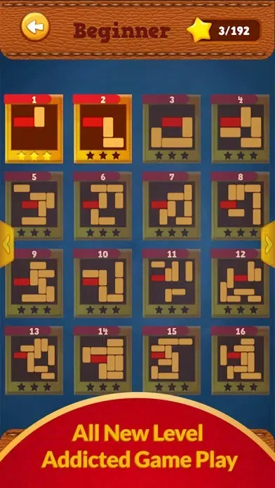-> Every puzzle is a board with red block stuck somewhere between the other wooden block, the concept is to solve the sliding puzzle and solve the block puzzle with your logic and thinking skills. There are multiple difficulty levels of puzzles to solve.