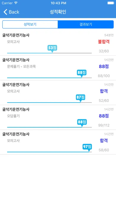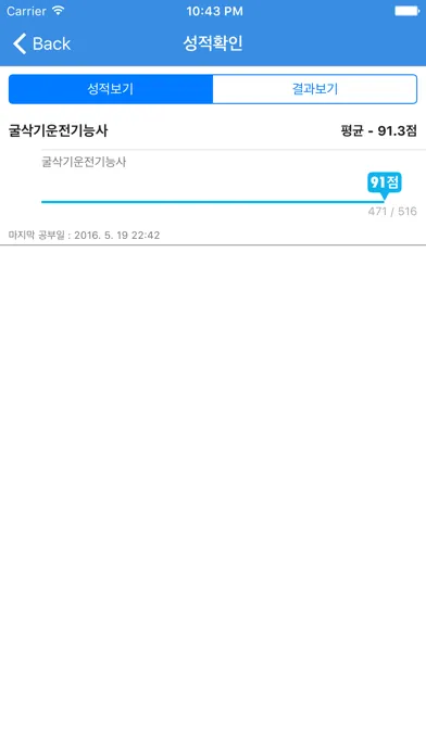 성적확인 - 각 과목별 성적 및 그동안 풀어본 기출문제와 모의고사, 문제풀기의 성적을 볼 수 있습니다.