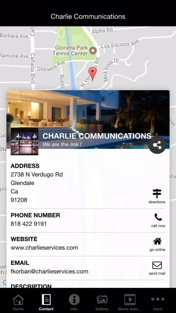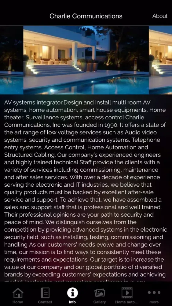 AV systems integrator.Design and install multi room AV systems, home automation, smart house equipments, Home theater. Surveillance systems, access control Charlie Communications, Inc was founded in 1990. It offers a state of the art range of low voltage services such as Audio video systems, security and communication systems, Telephone entry systems. Access Control, Home Automation and Structured Cabling.