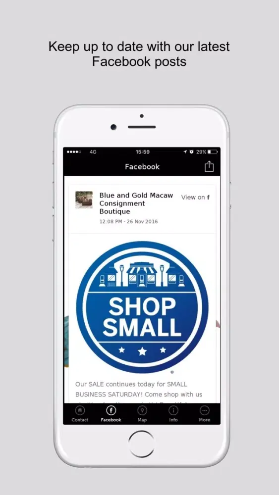 This App has Push Notification enabled which allows you to view App messages sent directly from the business straight to your lock screen; Push Notification feature must be enabled for this to work. App contains Integrated Facebook/Twitter feeds.