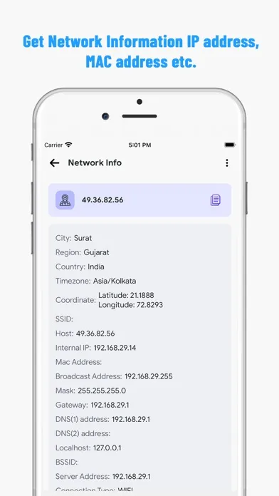 - Get your network information such as SSID, Internal IP address, mac address etc.