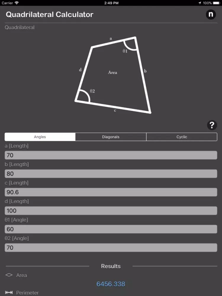 - Calculates the area and perimeter of a quadrilateral given four sides and two opposite angles.
