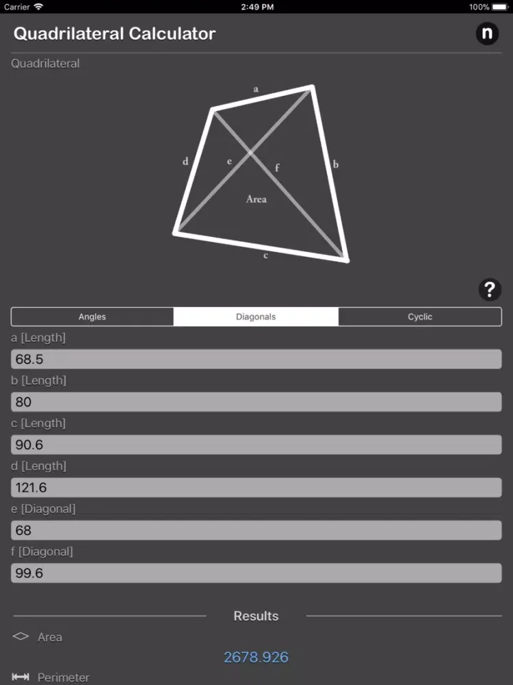 - Calculates the area and perimeter of a quadrilateral given four sides and two diagonals.