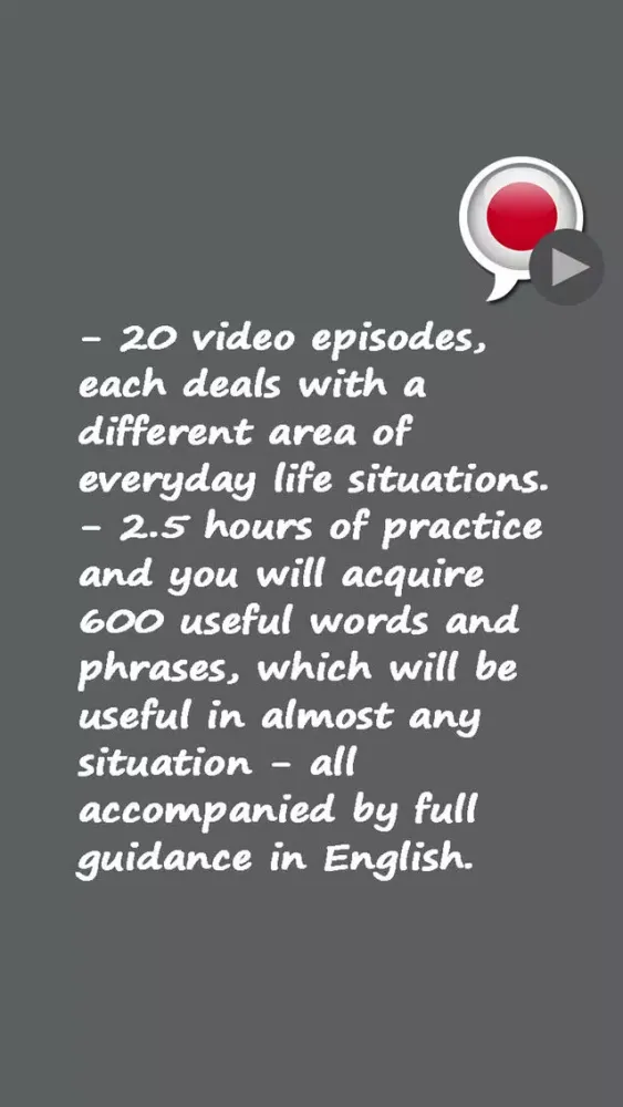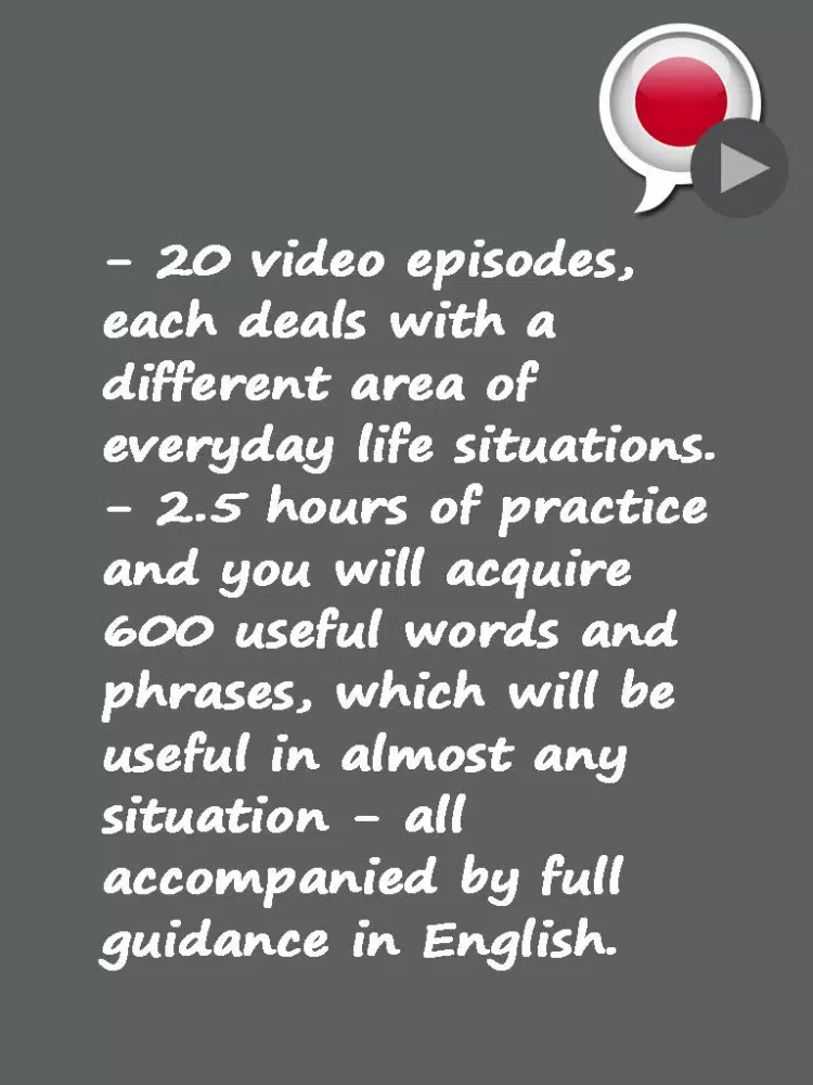 - 2.5 hours of practice and you will acquire 600 useful words and phrases, which will be useful in almost any situation - all accompanied by full guidance in English.