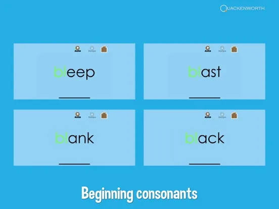 • Beginning consonants - (dr-ag, dr-um, dr-aw), 20 word groups and the beginning blends are highlighted in green