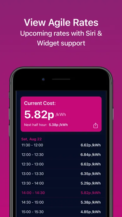 Note: Not all tariffs are supported, if your tariff does not work contact agilewatcher@icloud.com. Tested tariffs only with Agile incoming tariffs. Export rates are not supported. For Go/Intelligent/Fixed/Variable customers please download the Energy Watcher app for full support.