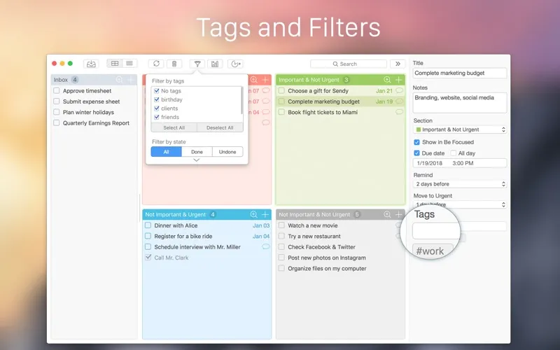 - Use the “Unsorted” section for tasks which are needed to be sorted by quadrants