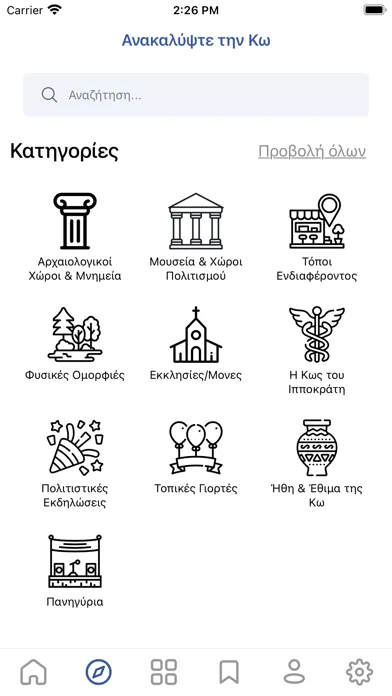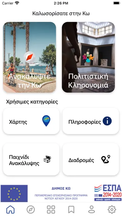 As part of the project a Mobile application was developed, which includes the cultural digital guide of Kos in three languages (Greek, English, German). The application provides detailed information on the annual events as well as the cultural events of the island , gives the possibility of remote access to valuable audiovisual cultural material and online booking of tickets for cultural events of the Municipality.