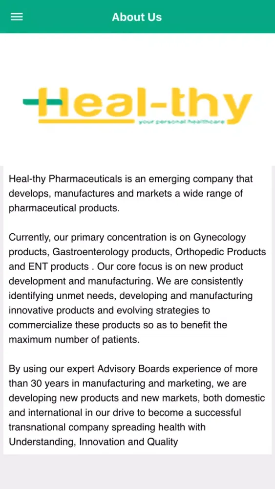 Heal-thy company has a wide range of pharmaceuticals products covering segment like Gynaecology,Gastroenterology,Orthopedic and ENT. It has many certificate like FDA and FSSAI certificate. There are many doctors in the Advisory Panel of the company