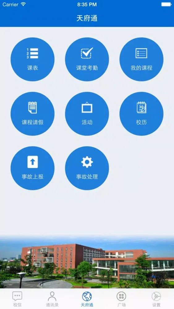 这是一款应用 于西南财经大学天府学院师生之间发送消息、通知、公告等的一款APP,能够发送消息、事故处理、学生签到、签到监控、校历查询,联系人查询,并且在广场中可以查看最新的校园新闻和通知等。