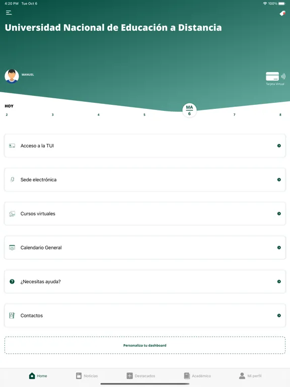• Perfil privado: Todos tus datos personalizados según tu perfil universitario. Consulta tus asignaturas, calificaciones, etc. Y también tu tarjeta universitaria digital. ¡Siempre la llevarás contigo!