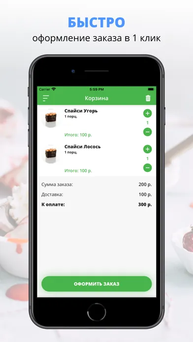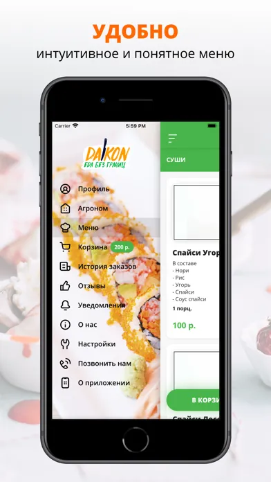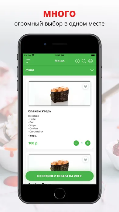 - Разнообразное меню роллов, суши, лапши WOK и напитков.