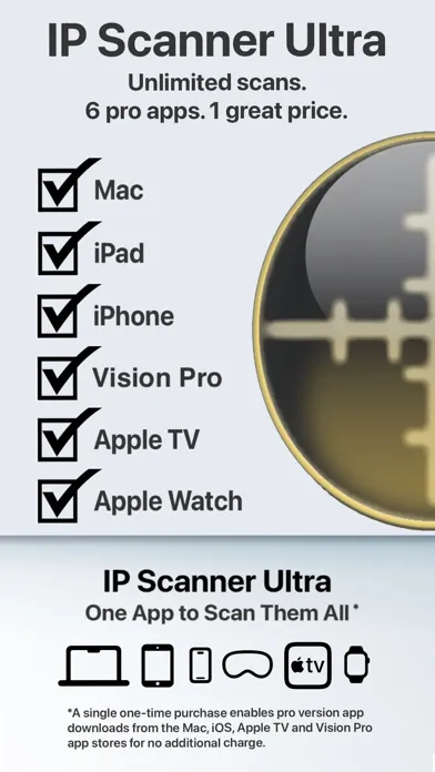 IP Scanner Ultra bundles our award-winning Mac, iPhone and iPad apps together with Apple TV, Apple Watch and now Vision Pro - 6 apps in one. Scan your local area network to determine the identity of all machines and internet devices on the LAN. Powerful results, yet easy and intuitive to use. It’s like a level 9 detect devices spell for your network!