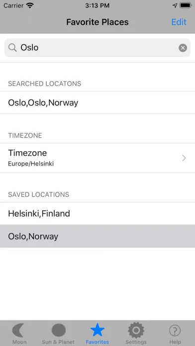 Save your favorite places to view sun and planet and moon rise/set times and moon phases.
