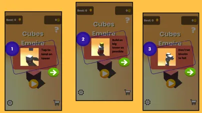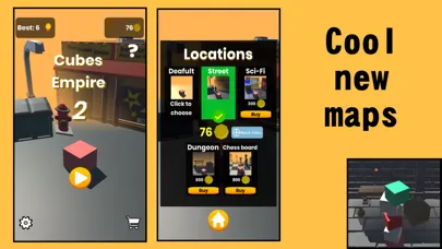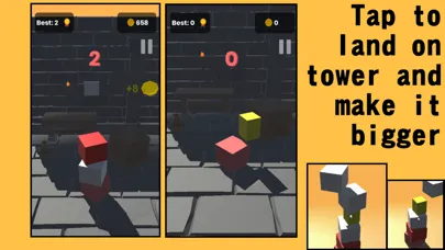 Land on tower to make it bigger. Each cube has its own feature, so be careful. And if your land won't be successful your tower will fall. Complete missions to get more points and even to get coins. The bigger tower you build the more points you will get? Set high records while building tower from different cubes. Collect coins to buy new maps in the shop. There are 5 available locations: default location, street, sci-fi, dungeon and chess board. But remember that your tower is very weak, so jump carefully. Random cubes will be moving toward to your tower. They can make your tower bigger or destroy it. Build the biggest cubes empire!
