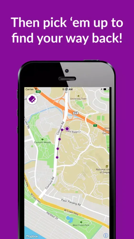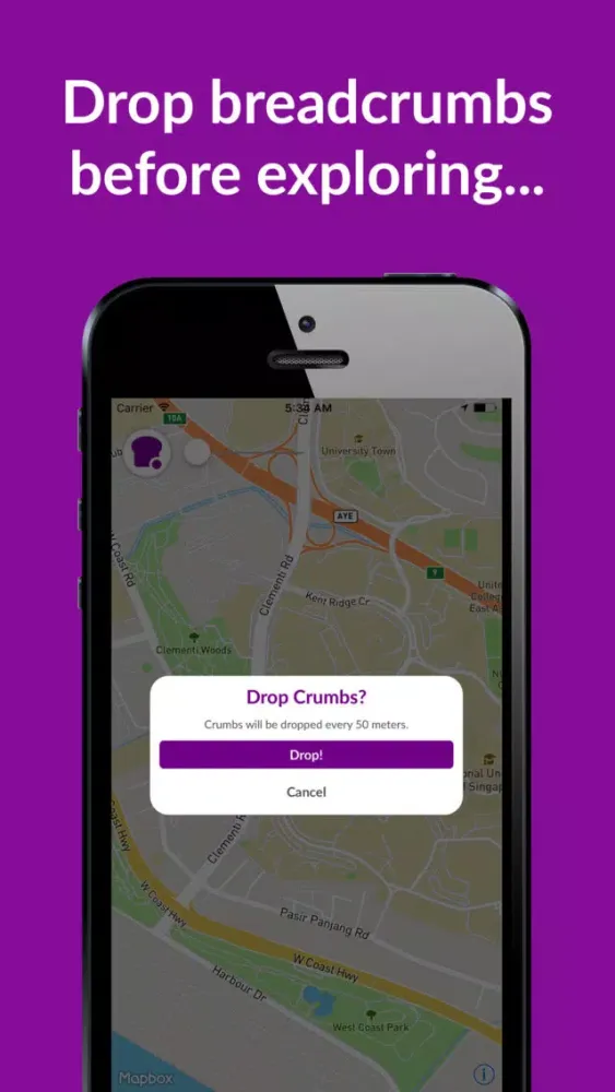Simply tap to start dropping crumbs at a selected interval whenever you are exploring unfamiliar territory. Then tap to retrieve the crumbs to retrace your steps.