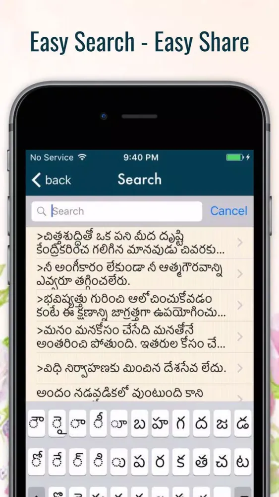 Telugu Quotes is ultimate app for relax and inspire your mind. It contains selected 600+ quotes. This is very easy to read Telugu Quotes and easy to search which is on your mind and easy to share to social media !!!