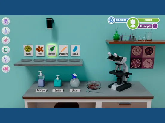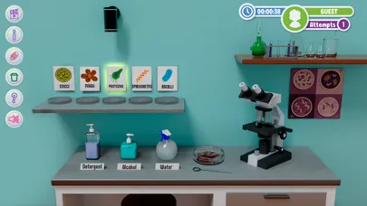 In this practice, you are a volunteer participant in a day of animal vaccination. Your mission is to identify, through the elements of the laboratory and a microscope, a series of microorganisms present in the vaccination area and choose the correct cleaning elements that can effectively combat these microorganisms.