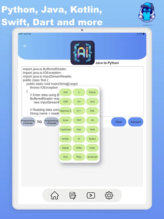 3. Code Converter: Seamlessly convert code between popular programming languages, such as Python, Java, Kotlin, Swift, Dart, and more, with just a few clicks.