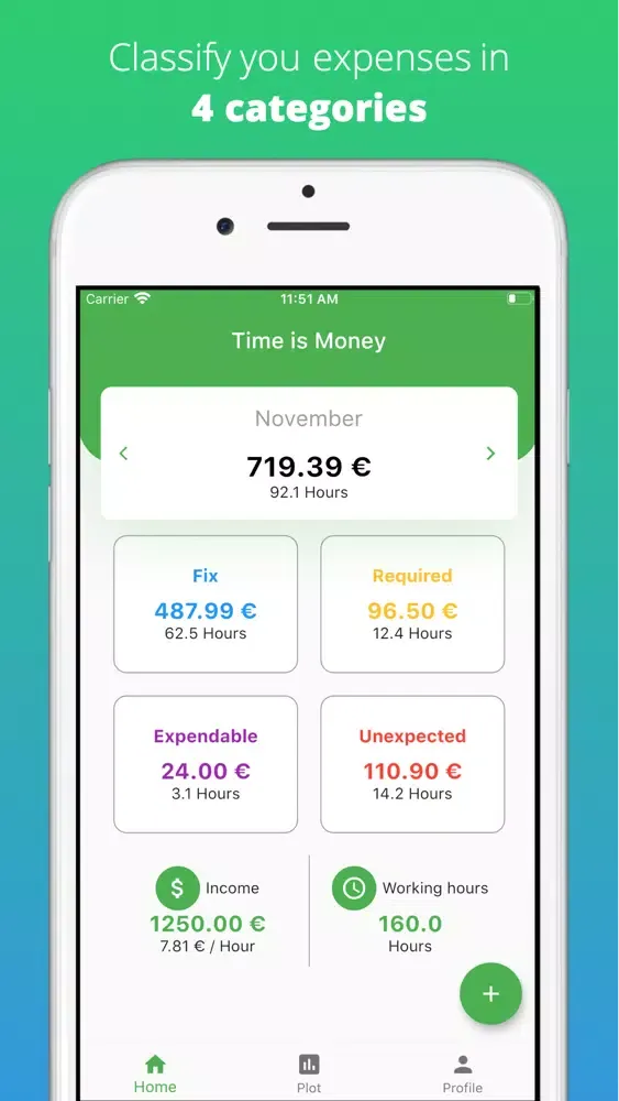 Everyone can buy the same with 100€, but each person has to work a different number of hours to earn them. With Time is Money you will be able to know how many hours you have to work to buy that mobile or have your dreamed holidays.