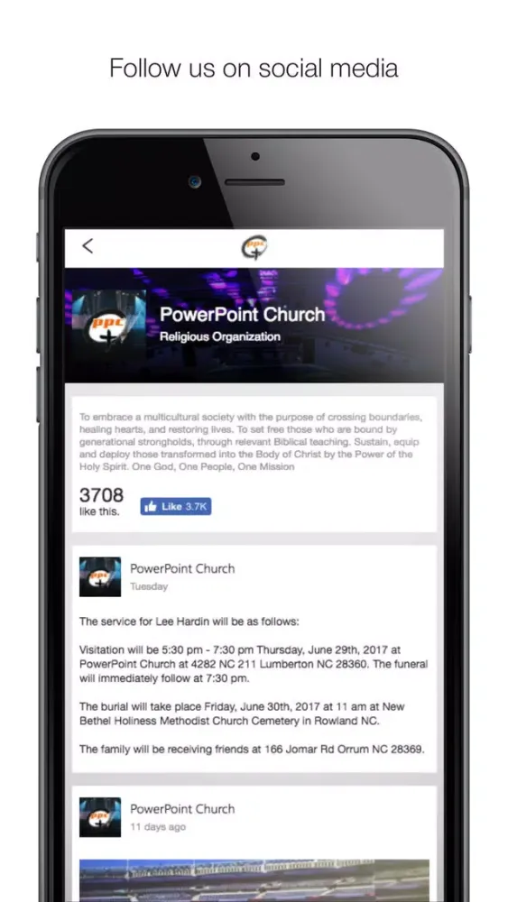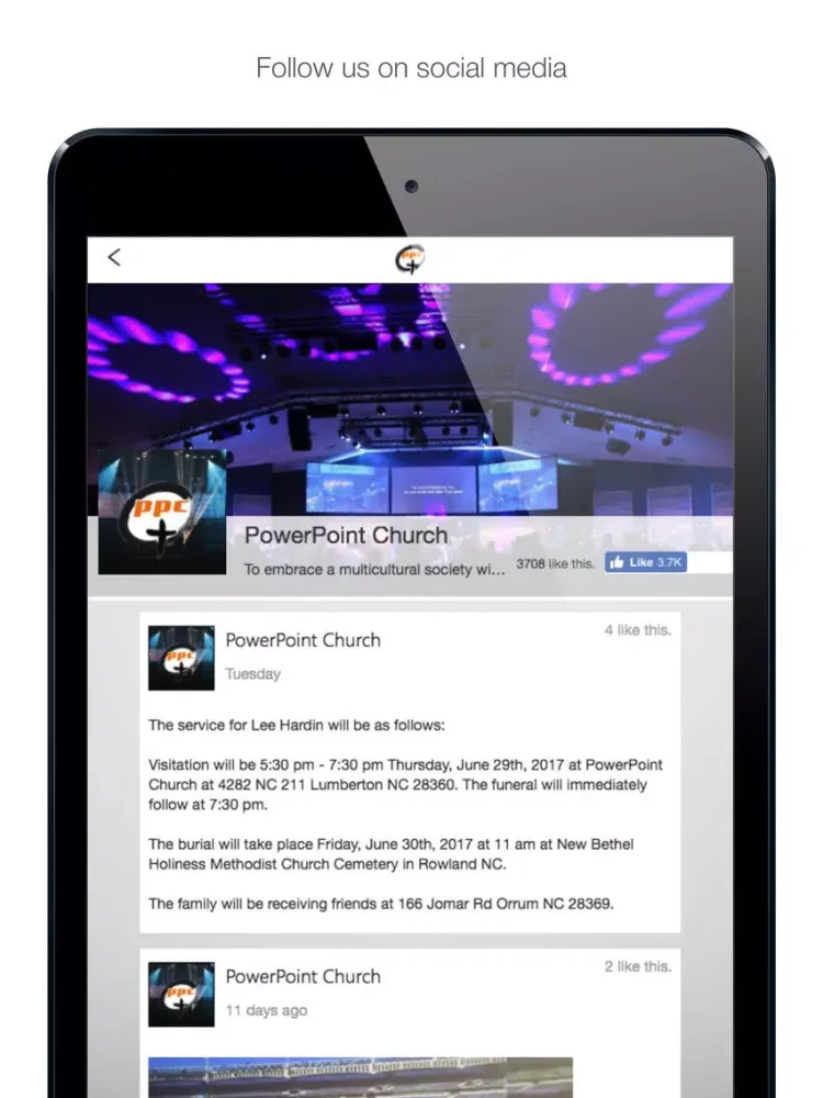 Connect and engage with the PowerPoint Church app! You will be able to fill out prayer request cards, give, get a map to the church, and more!