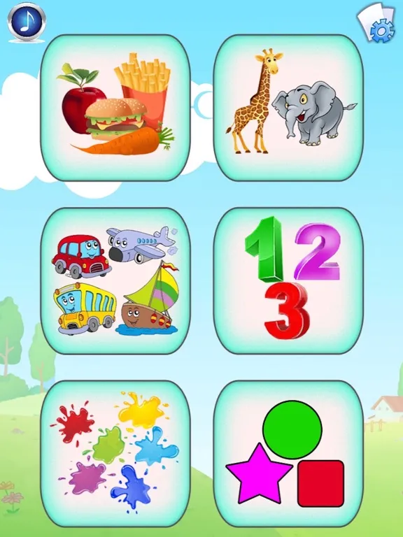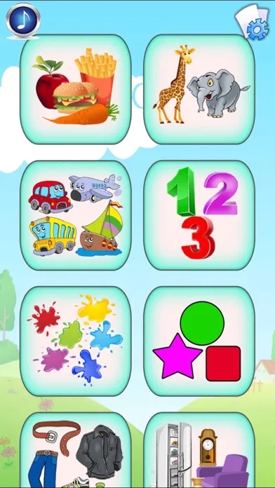 Categories include: Food items, Animals, Transportation, Alphabet, Numbers, Colors & Shapes, Clothing, Household items, Body Parts, Outdoor items, Music Instruments/Arts & Learning.