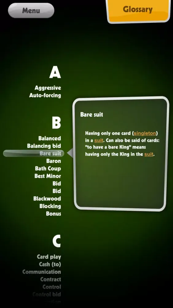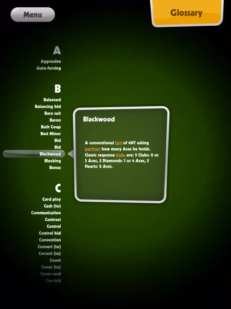 Finally, a comprehensive bridge glossary allows you keep on top of all bridge vocabulary.