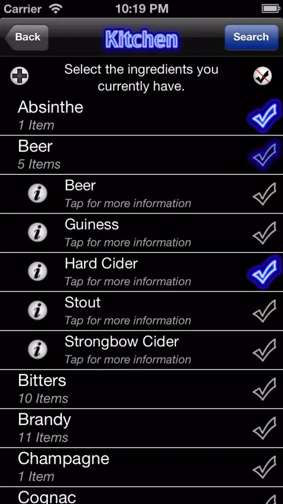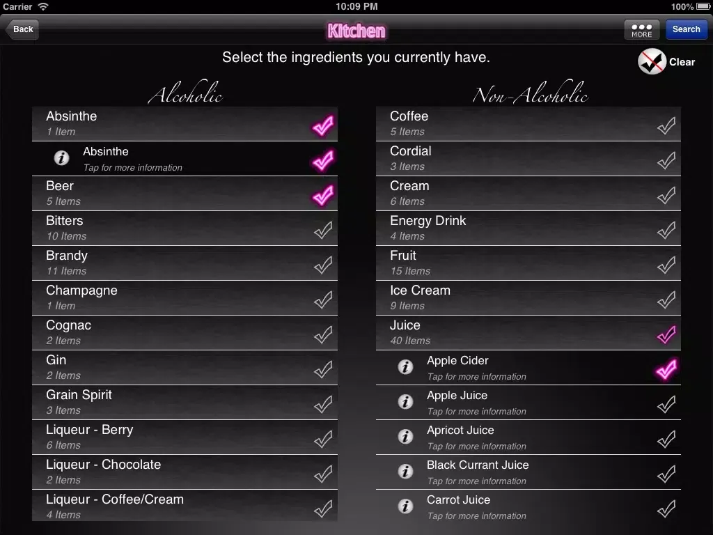•For those who know their liquor cabinet by heart this feature is definitely for you. Just simply input every single type of liquor you own, no matter the shape or size, and Mr. Bartender will display out a list of every cocktail/drink recipe that you can possible make.